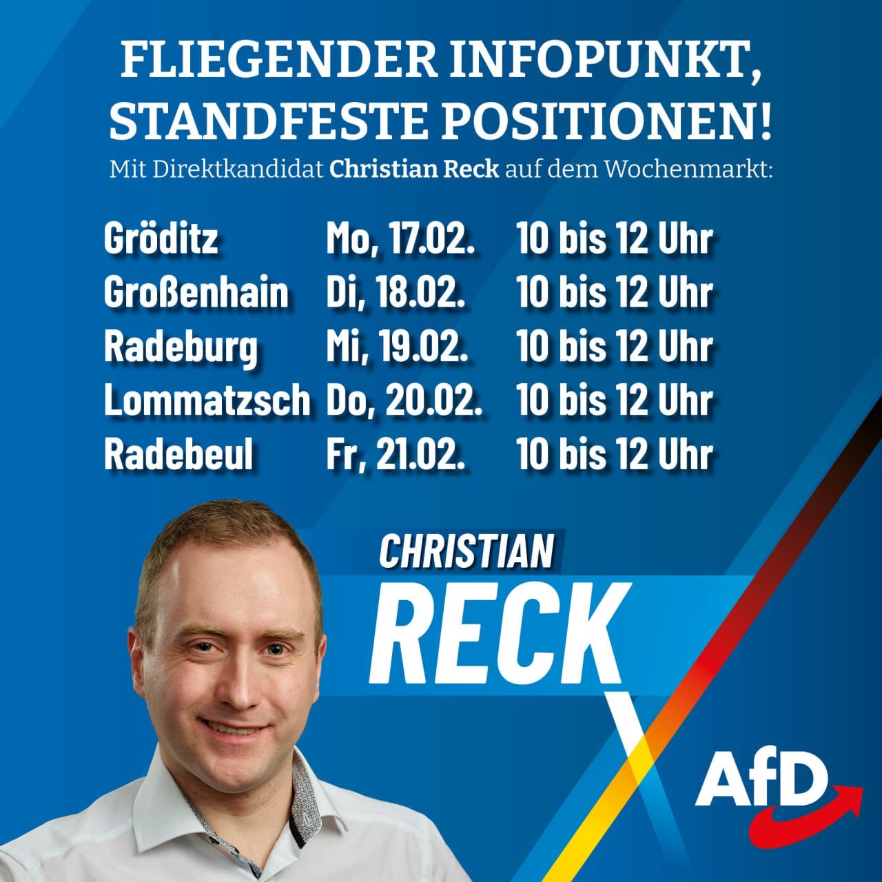 Mit Direktkandidat Christian Reck auf dem Wochenmarkt: Gröditz             Mo, 17.02.    10 bis 12 Uhr Großenhain     Di, 18.02.    10 bis 12 Uhr Radeburg         Mi, 19.02.    10 bis…