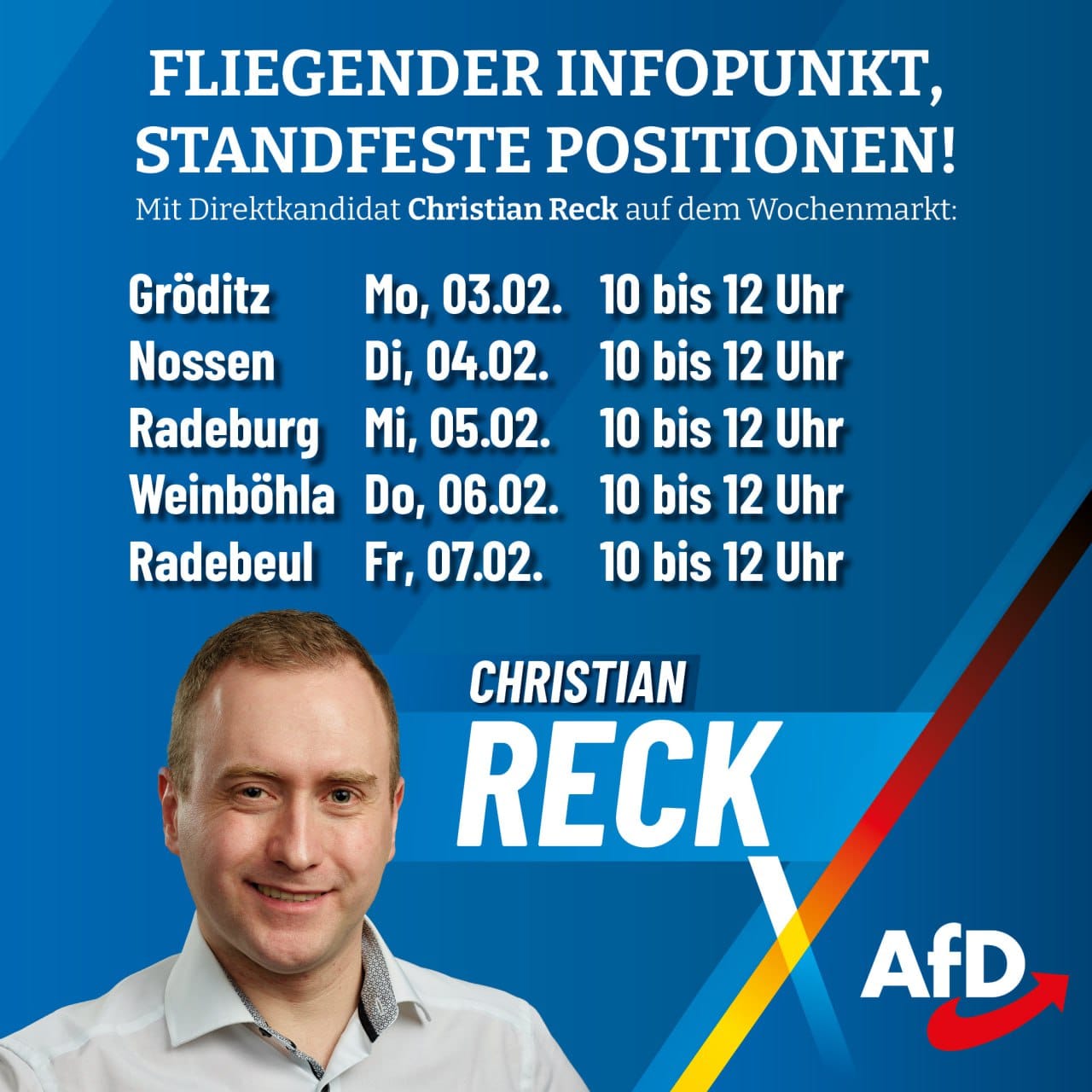 Mit Direktkandidat Christian Reck auf dem Wochenmarkt: Gröditz       Mo, 03.02.    10 bis 12 Uhr Nossen       Di, 04.02.    10 bis 12 Uhr Radeburg   Mi, 05.02.    10 bis…